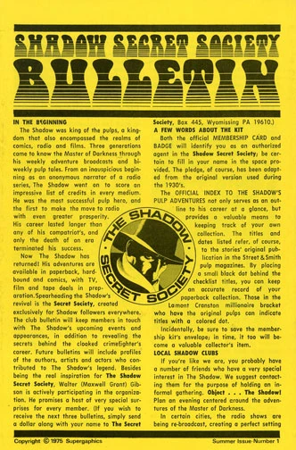 This four-page issue contains information about The Shadow from the Pulps and the origin of his Girasol ring. There is also a Pyramid Books preview, an Edd Cartier illustration and mentions that Walter B. Gibson will be the Guest of Honor at the 1975 Comic Art Convention in NYC.
